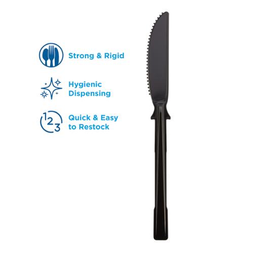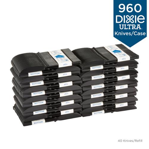 The Dixie Ultra® SmartStock® Series-T Polystyrene Disposable Plastic Knife Refill is designed for use in the Dixie Ultra® SmartStock® Series-T Tri-Tower Disposable Plastic Cutlery Dispenser (DUSSTDSP3). Pre-counted and pre-assembled SmartStock® refills make it fast and easy to restock an empty dispenser. Just pick up a new cutlery refill, slide it into the dispenser, rip and pull away the binding tape, close the door and you’re done. It’s really that simple! <p>
