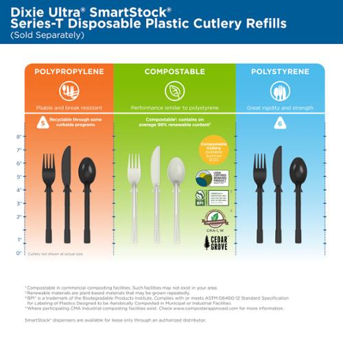 Dixie Ultra® SmartStock® Series-T Polystyrene Cutlery is also available in Fork (DUSSF5), Teaspoon (DUSST5) and Soup Spoon (DUSSS5) refills, as well as Polypropylene Fork (DUSSPF5), Knife (DUSSPK5), Teaspoon (DUSSPT5) and Soup Spoon (DUSSPS5) refills and newly launched Compostable Fork (DUSSCF7), Knife (DUSSCK7) and Teaspoon (DUSSCT7) refills!