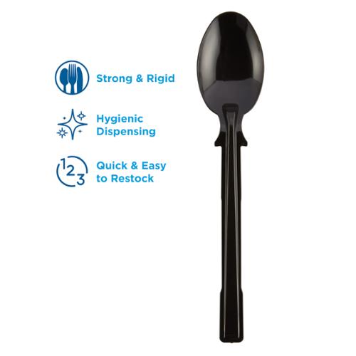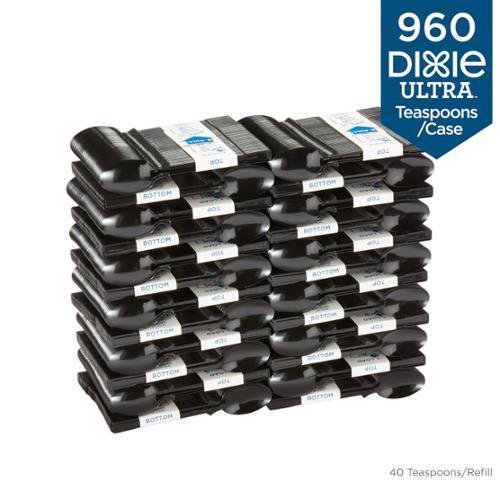 The Dixie Ultra® SmartStock® Series-T Polystyrene Disposable Plastic Teaspoon Refill is designed for use in the Dixie Ultra® SmartStock® Series-T Tri-Tower Disposable Plastic Cutlery Dispenser (DUSSTDSP3). Pre-counted and pre-assembled SmartStock® refills make it fast and easy to restock an empty dispenser. Just pick up a new cutlery refill, slide it into the dispenser, rip and pull away the binding tape, close the door and you’re done. It’s really that simple!